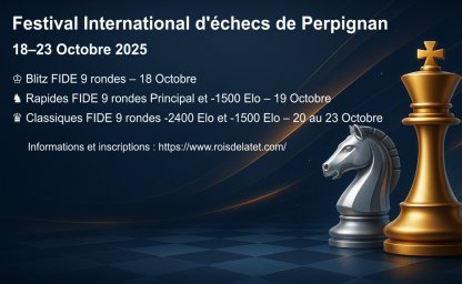 Le Festival de Perpignan 2025 (8ème édition) se tiendra du 18 au 23 Octobre, comprenant un Blitz, un Rapide (Principal et -1500 Elo) et un (…)