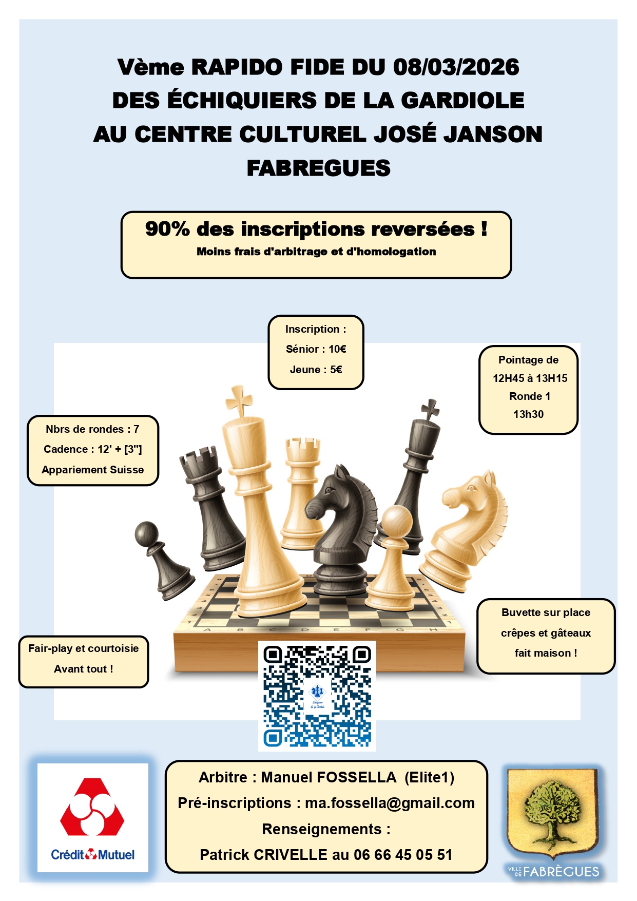 Le dimanche 8 mars prochain le club des Échiquiers de la Gardiole organise un tournoi rapide FIDE à Fabrègues : 7 rondes en 12’+3" sur l’après-midi.