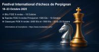 Le 8ème Festival International d’Échecs de Perpignan se déroulera du 18 au 23 Octobre 2025 Salle Bolte 77 rue Jean-Baptiste Lulli 66000 Perpignan.